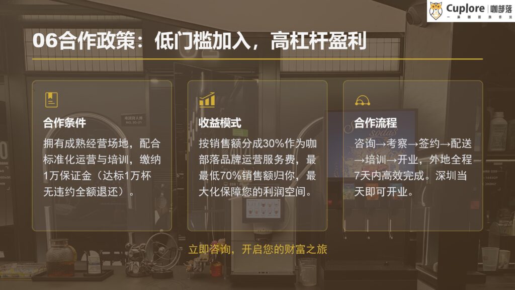 如果你有门店:✨建议你的门店挪 1㎡增设现磨咖啡☕无需房租、无需专人,我们免费提供智能咖啡机,全链路合作 + 销售分成,保证金达标全额退。既能提升门店档次与客户体验,增加美团等平台好评👍还能贴合年轻客群消费习惯,精准锁定年轻客源,新增稳定营收💰零风险、轻投入,轻松为门店增收引流~